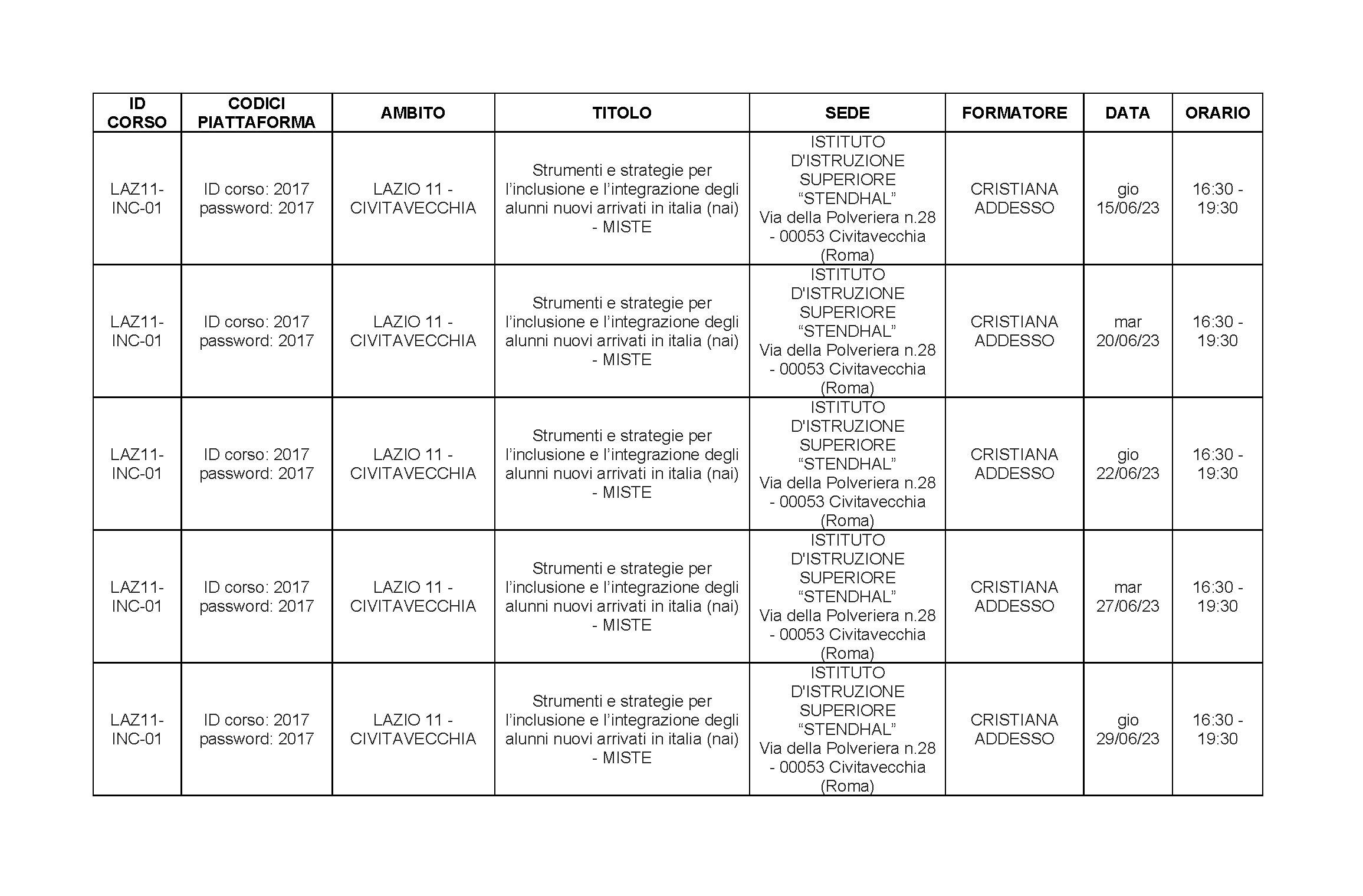 Di seguito il calendario contenente i codici e-learning.