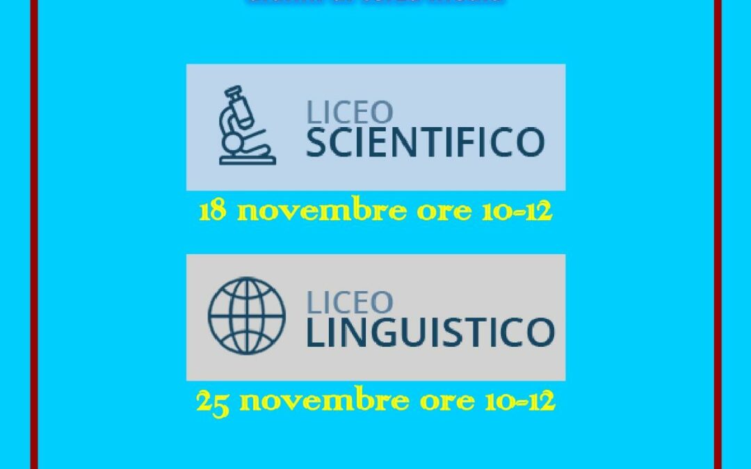 La scuola apre le porte agli studenti frequentanti l’ultimo anno della scuola secondaria di primo grado per presentare la propria offerta formativa attraverso l’opportunità di partecipare ad attività laboratoriali per sperimentare e immaginarsi al Liceo nelle giornate del 18 Novembre per gli indirizzi scientifici e del 25 Novembre per gli indirizzi linguistici, dalle ore 10 alle ore 12.